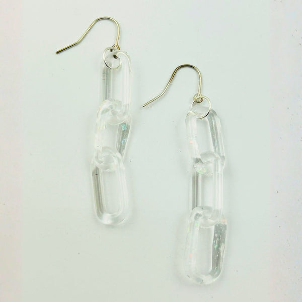 Borosilicate glass with crushed opal inside with a sterling silver chain.